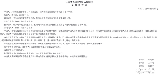 《彭博》周一 (19/7) 報道引述無錫市中級人民法院裁定書指,中國恒大(3333)在內地遭廣發銀行,申請凍結宜興市恆譽置業有限公司、恆大地產集團有限公司銀行存款 1.32 億元人民幣,或查封、扣押其他等值財產。.